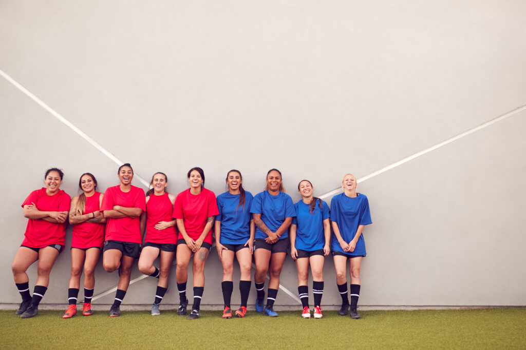 Graphic Shot Of Womens Football Team Leaning Against Wall Whilst Training For Soccer Match